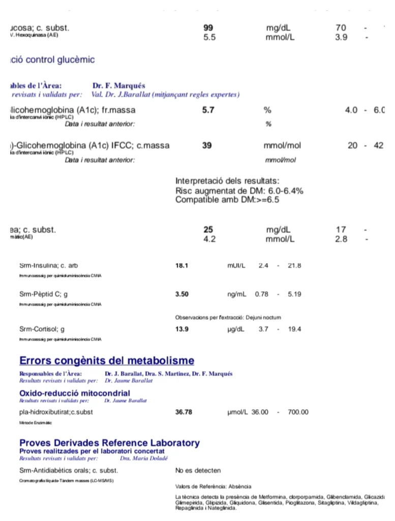 Si no soy diabetica (tampoco se ponen de acuerdo en si es prediabetes o qué) pero debo hacer vida como si lo fuera (dieta, controlar mis niveles de azúcar, etc…) me pregunto si hay alguien más aquí a quien le pase algo parecido y pueda orientarme. No entiendo qué me pasa y nadie sabe darme una explicación. Que si puede ser hipoglucemia reactiva. Que si puede ser resistencia a la insulina… No eres diabetica…. Entoces que es? Es desesperante. He dejado unas fotos de mi última analítica. Por si alguien puede darme algún dato más que me ayude. Obviamente la analítica es mucho más extensa. Solo he capturado los datos que creo más importantes.