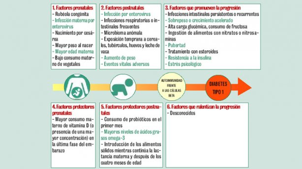 Se han descrito diversos factores ambientales que protegen o promueven la autoinmunidad frente a las células beta o la progresión a diabetes. En verde, los que cuentan con mayor evidencia. (The Lancet)