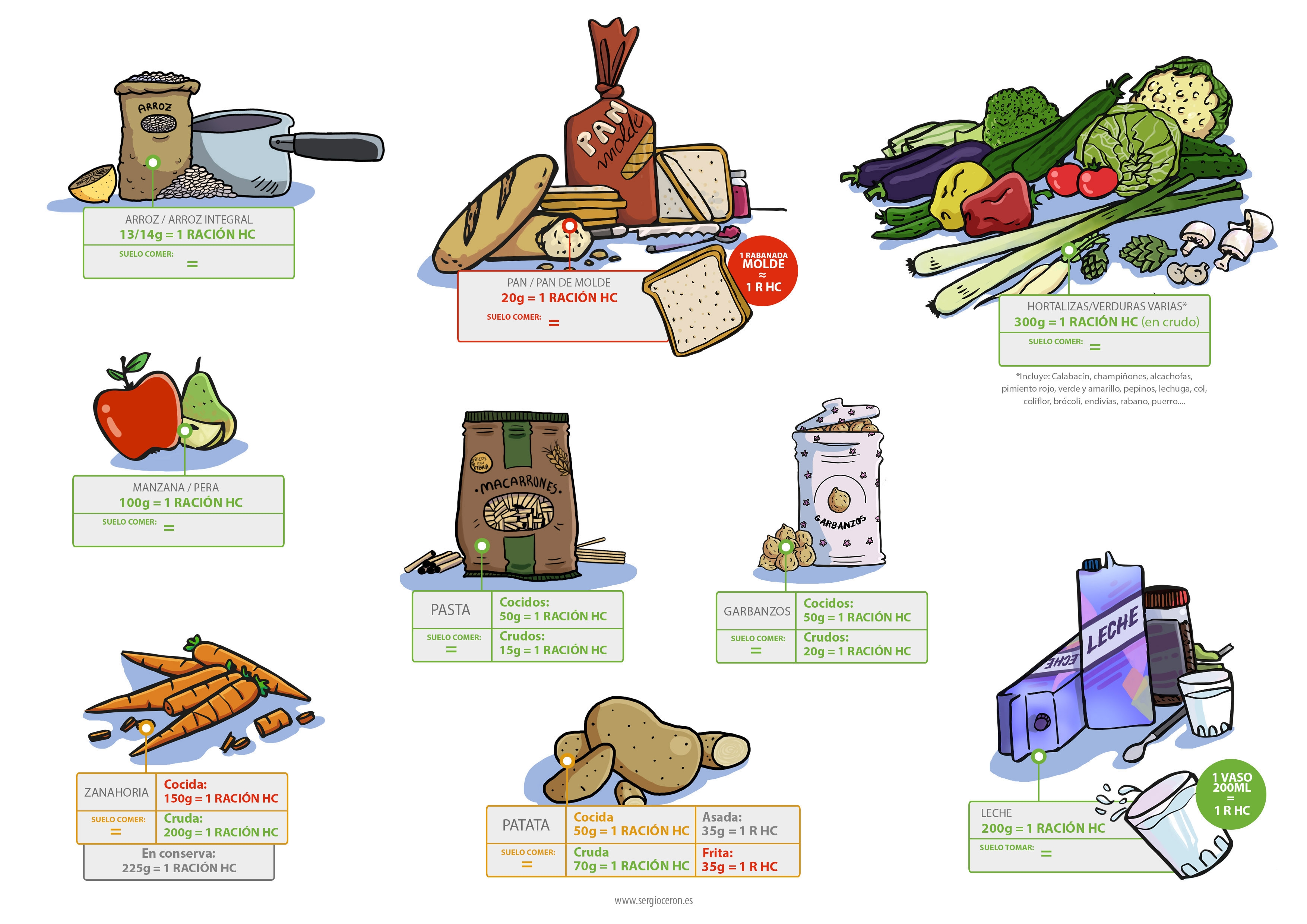 Soy ilustrador y diseñador gráfico, y cuando debuté se me ocurrio hacerme una «tabla» ilustrada con los alimentos que más suelo consumir y sus pesos por ración de carbohidratos.