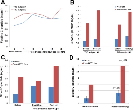 Otra paciente de diabetes tipo 1 había tenido la enfermedad durante cuatro años cuando recibió el tratamiento. De cualquier forma tuvo mejora en los niveles de péptido C, pero no se consideró en remisión. Las demás seis personas con diabetes tipo 1 experimentaron reducciones en los niveles de péptido C con el tiempo. Los autores del estudio dijeron que esto sugiere que quizá se necesite más de un tratamiento.